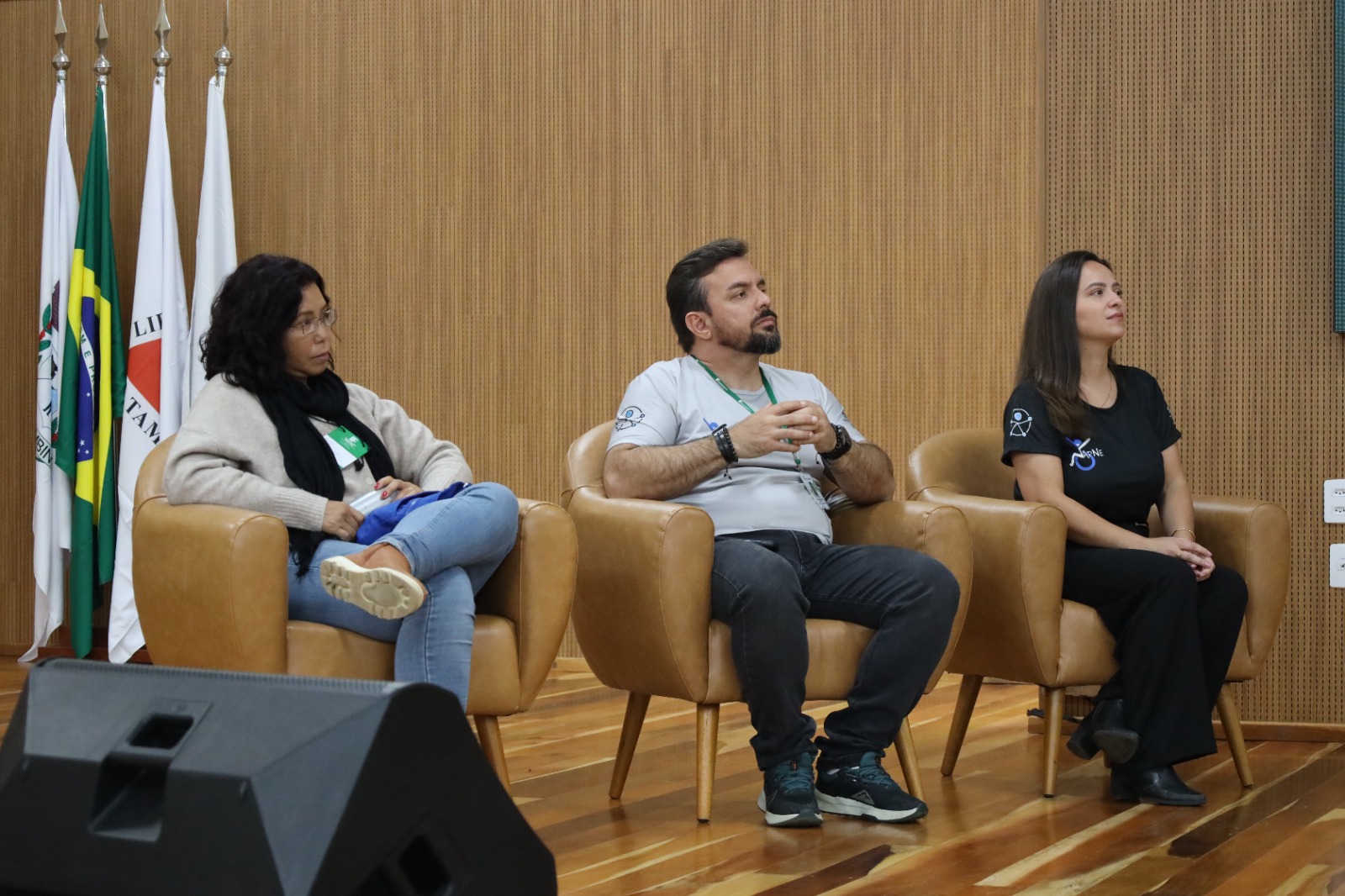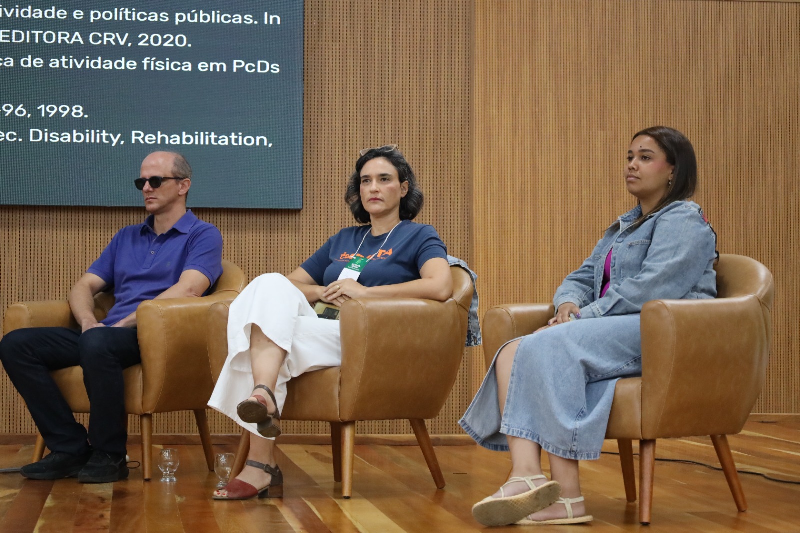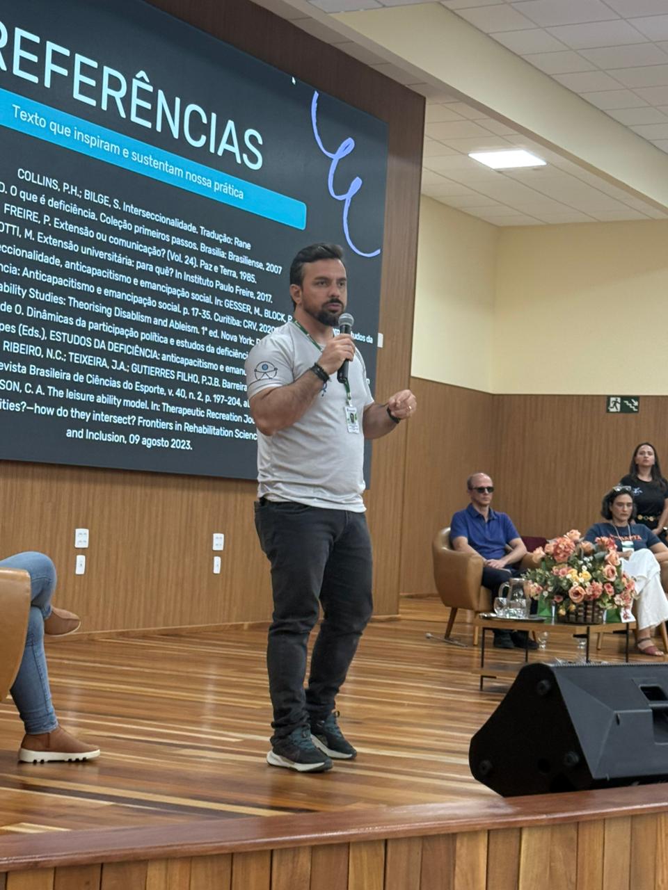 A professora Lia Polegato, juntamente com Sérgio Garcia e Sara Mateus, abriram o ciclo de debates destacando a importância da extensão inclusiva e do diálogo com a comunidade externa. Sua fala enfatizou que práticas inclusivas ganham força quando são construídas com as pessoas, e não para elas — valorizando a escuta ativa e o protagonismo dos sujeitos com deficiência nos processos de transformação social.