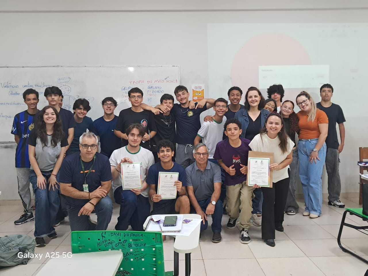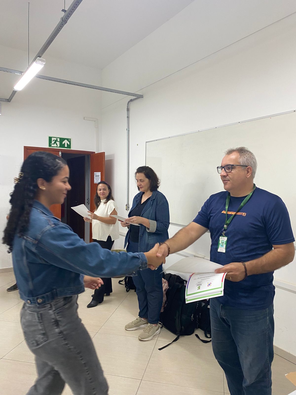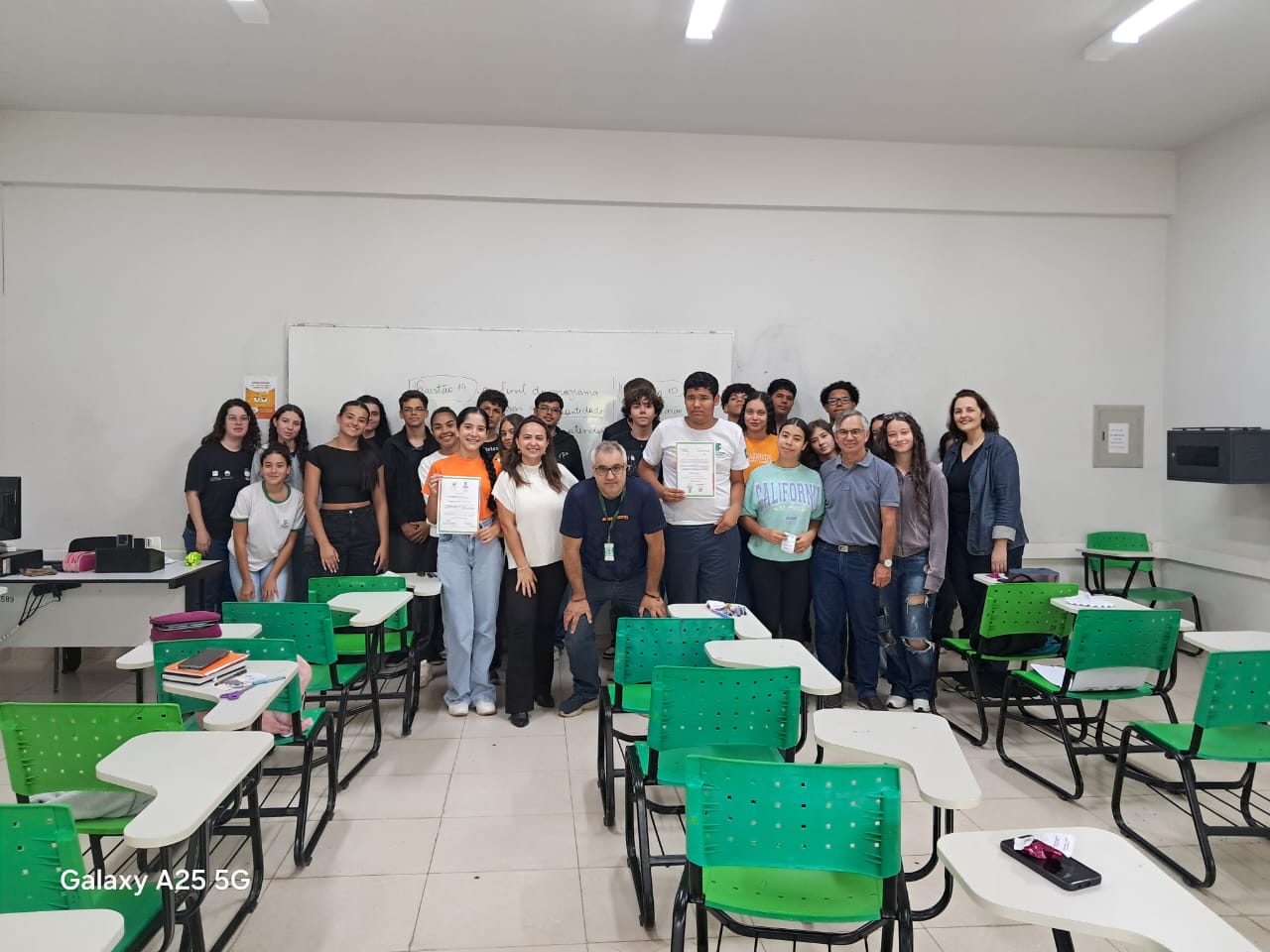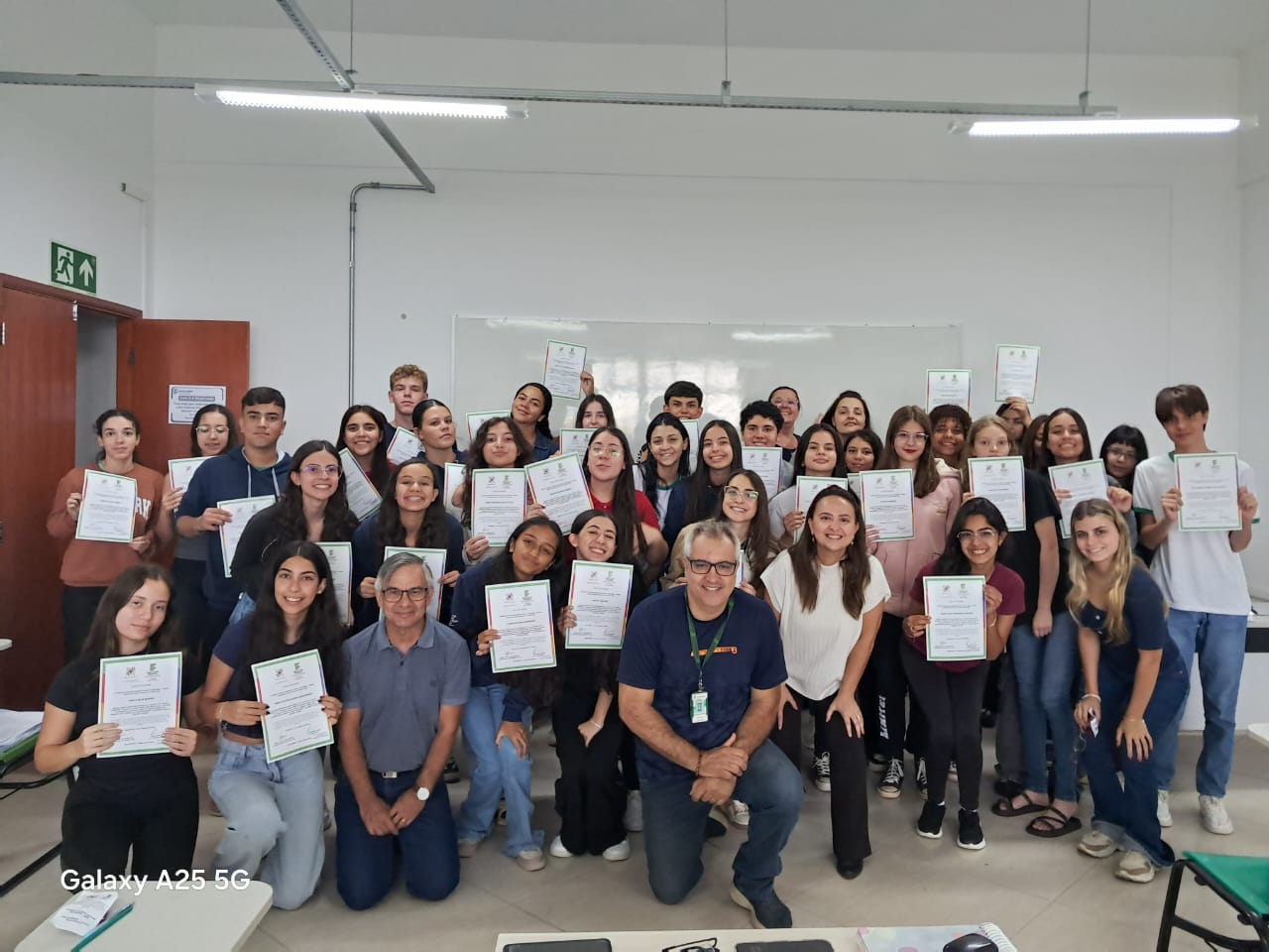 Como forma de reconhecimento, os estudantes que participaram de 80% ou mais das oficinas em todos os bimestres receberam certificados de participação. A entrega foi realizada diretamente nas salas de aula, com a presença dos professores responsáveis pelas oficinas, da Coordenadora Geral de Ensino e do Diretor de Ensino do campus, Hugo Baldan Júnior, que percorreram as oito turmas para celebrar o encerramento da proposta junto aos estudantes.